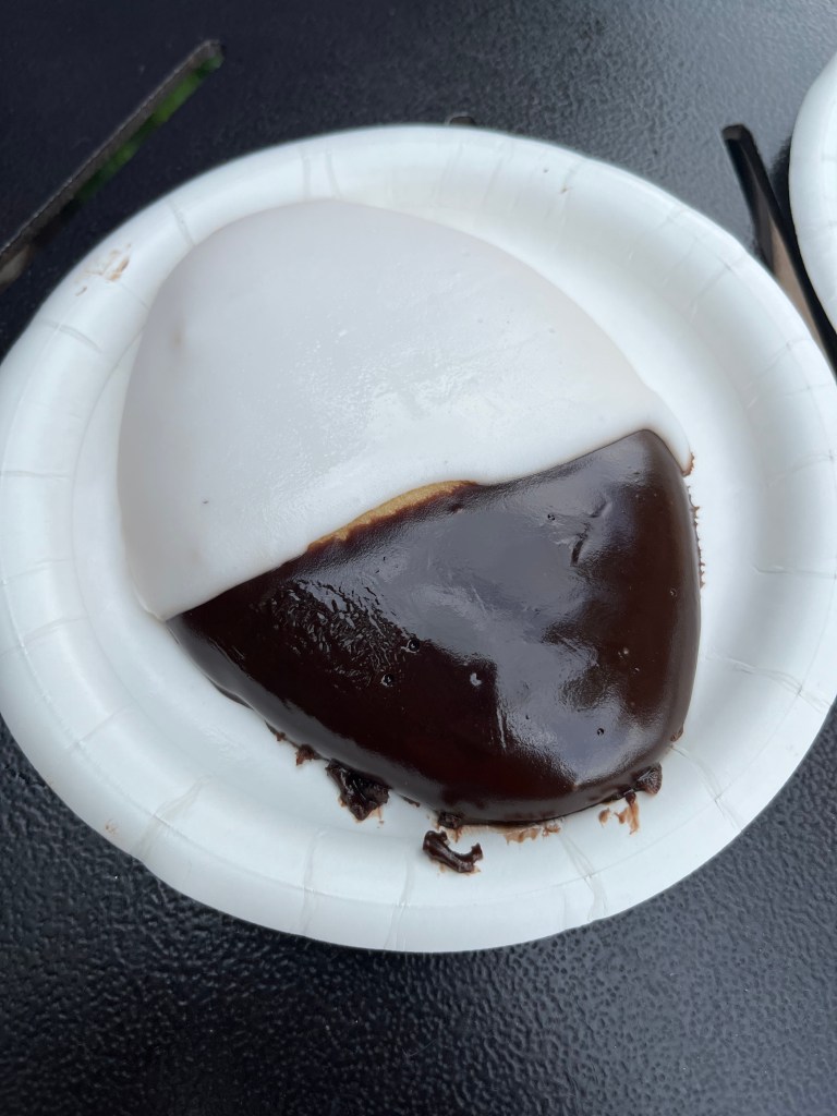 This is the Black & White cookie (a.k.a. the half-moon cookie) from the L’Chaim Holiday Kitchen booth located in between France and Morocco. Now, I am a big fan of black & white cookies. This one was just how I like ’em. The cookie was super soft, almost cake like, and the frosting was fresh and super rich with a chocolatey flavor.