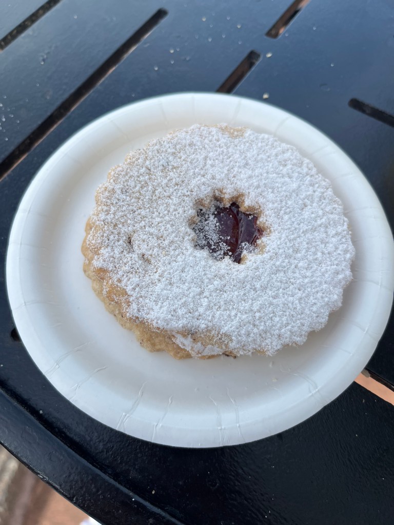 The last cookie I had was the Linzer Cookie from the Bavaria Holiday Kitchen located in Germany. The two shortbread cookies were so yummy and that raspberry filling in between them was delicious. Be prepared to have your fingers be covered in powdered sugar.