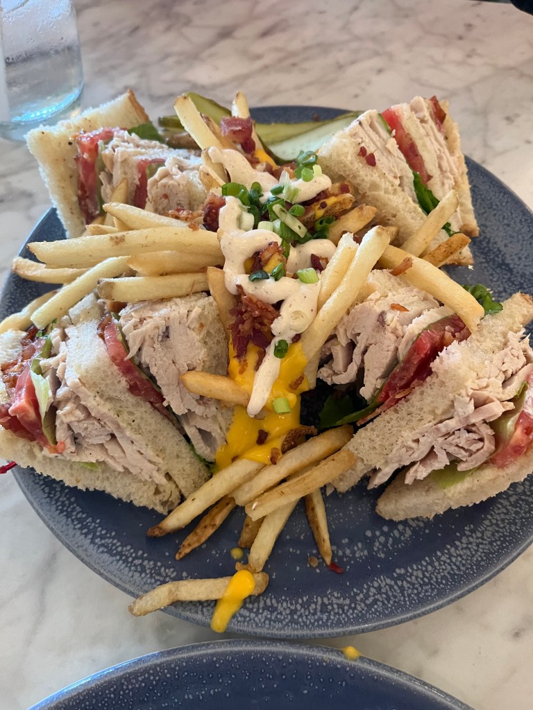 I was never a big fan of turkey until I tried this turkey club. Paired with the Plaza Loaded Fries in the picture, this sandwich is made with house-roasted turkey, smoked bacon, lettuce and tomato on a sourdough toast. What really brings it all together is the lemon-pepper mayonnaise. It gives a subtle tangy flavor that offsets the turkey and smoked bacon very nicely.