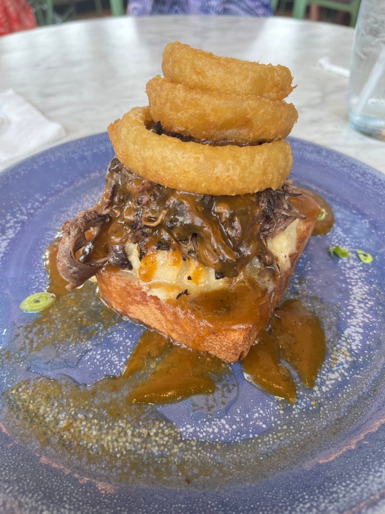 When I first started working here, the pot roast stack was a chef’s special but considering how popular it become, it turned into a permanent dish on the menu. This dish consists of slow roasted beef piled on top of a piece of thick cut Texas toast with mashed potatoes, drenched with caramelized onion gravy and onion rings as the crown on top. The pot roast simply melts in your mouth and the mash with gravy brings a boat load of flavor that just sings perfectly together.